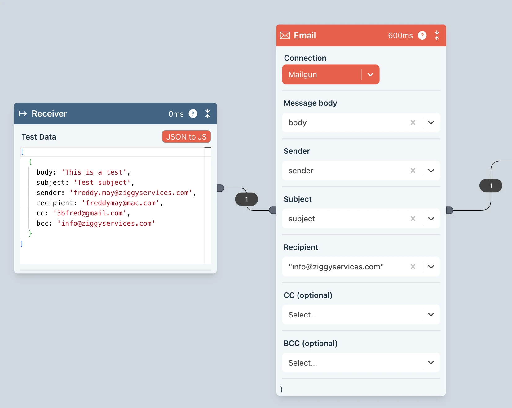 • Hard code any field by entering the value in "your value" (use double quotes). You can see this in the above screenshot for the Recipient field "info@ziggyservices.com".