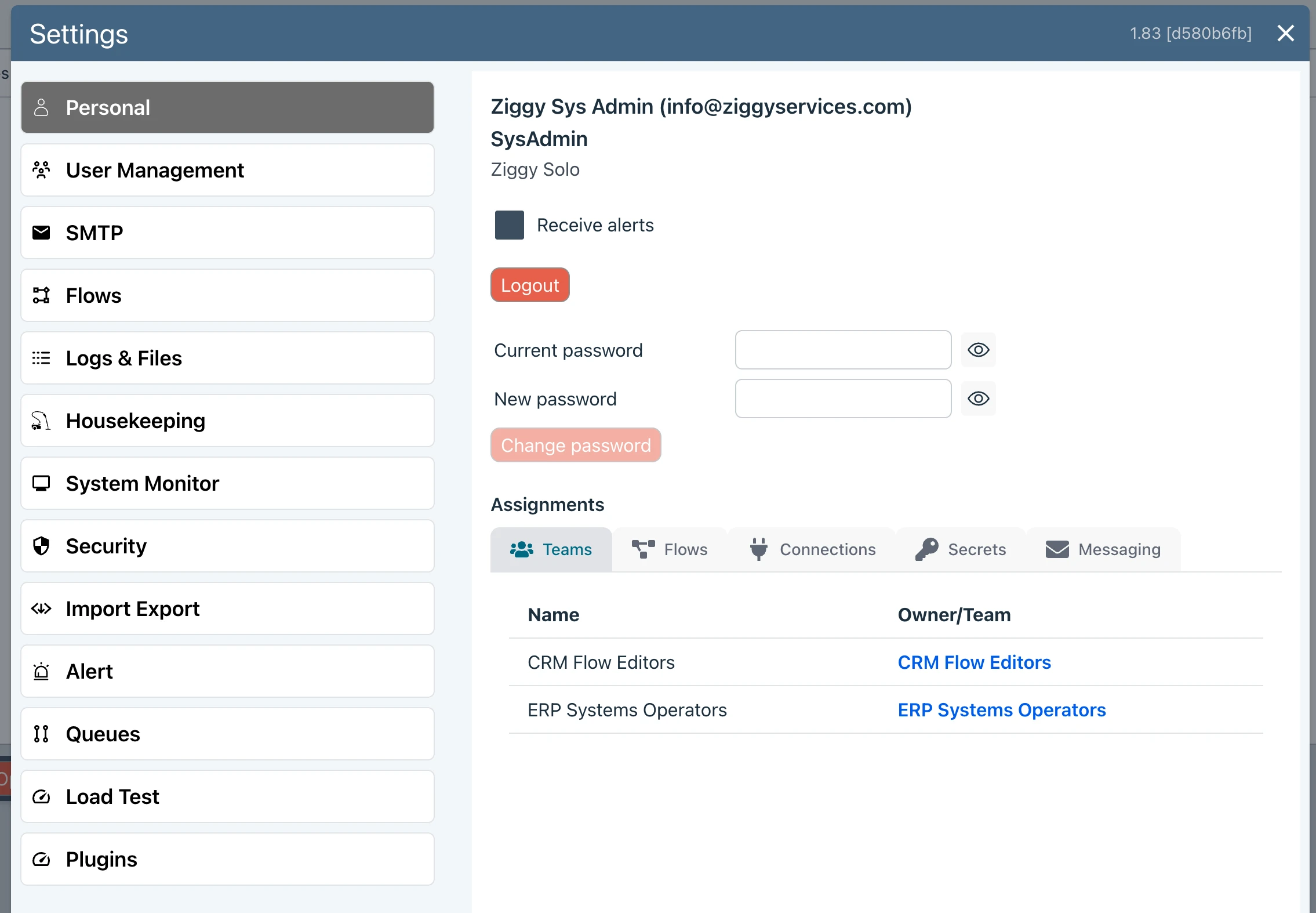 - User Details - Display the logged in user's email, display name and organization. Note that for non mult-tenant systems the organization is called Ziggy Solo.